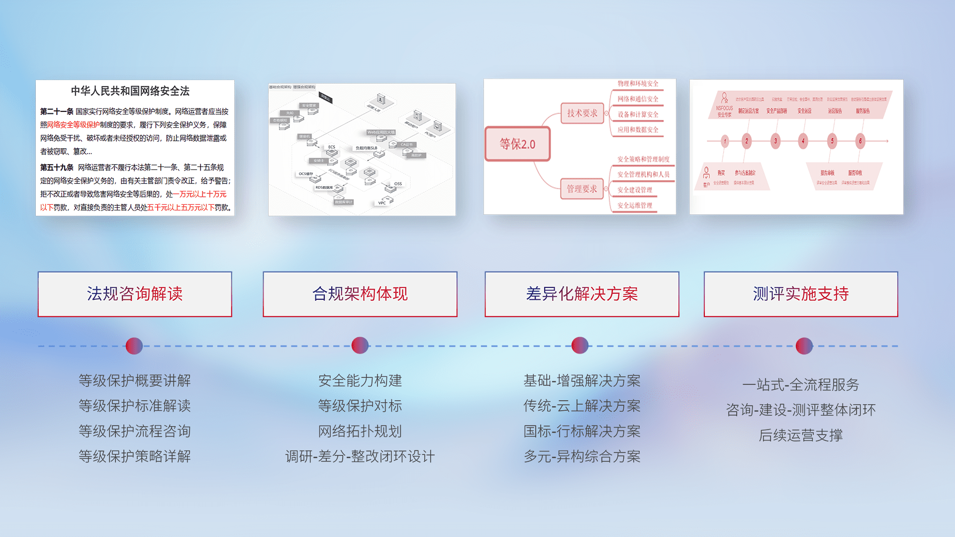 通过专业的法律咨询解读、、合规架构体现、、、、差异化解决方案、、测试实施支持等服务,,,,为客户量身打造等保合规体系。。。。